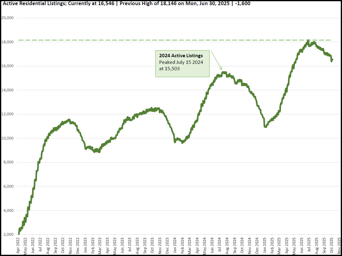 Pending listings tell a different story. At 3,795, pendings are down 5.6% YoY, with cumulative pendings for 2025 now 9.4% below 2024. That combination — rising inventory and fewer accepted contracts — pushes the Activity Index down to 18.7%, compared with 21.6% a year ago. In simpler terms, buyers have regained control of the tempo, and homes are moving more slowly.