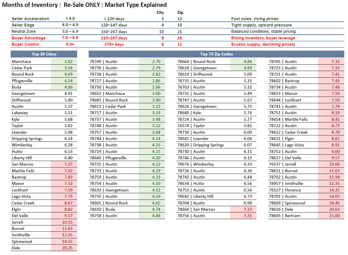 As we finish October 2025, the Austin resale housing market continues to reveal its direction through one of the most reliable indicators of market balance — Months of Inventory (MOI). This measure, which calculates how long it would take to sell all current listings at the existing sales pace, now offers a clear snapshot of how supply and demand are realigning across the region. By analyzing Austin’s 30 cities and 75 ZIP codes through five distinct market phases — from Seller Acceleration to Buyer Control — we can see precisely where pricing power resides and how momentum is shifting as we close the month.