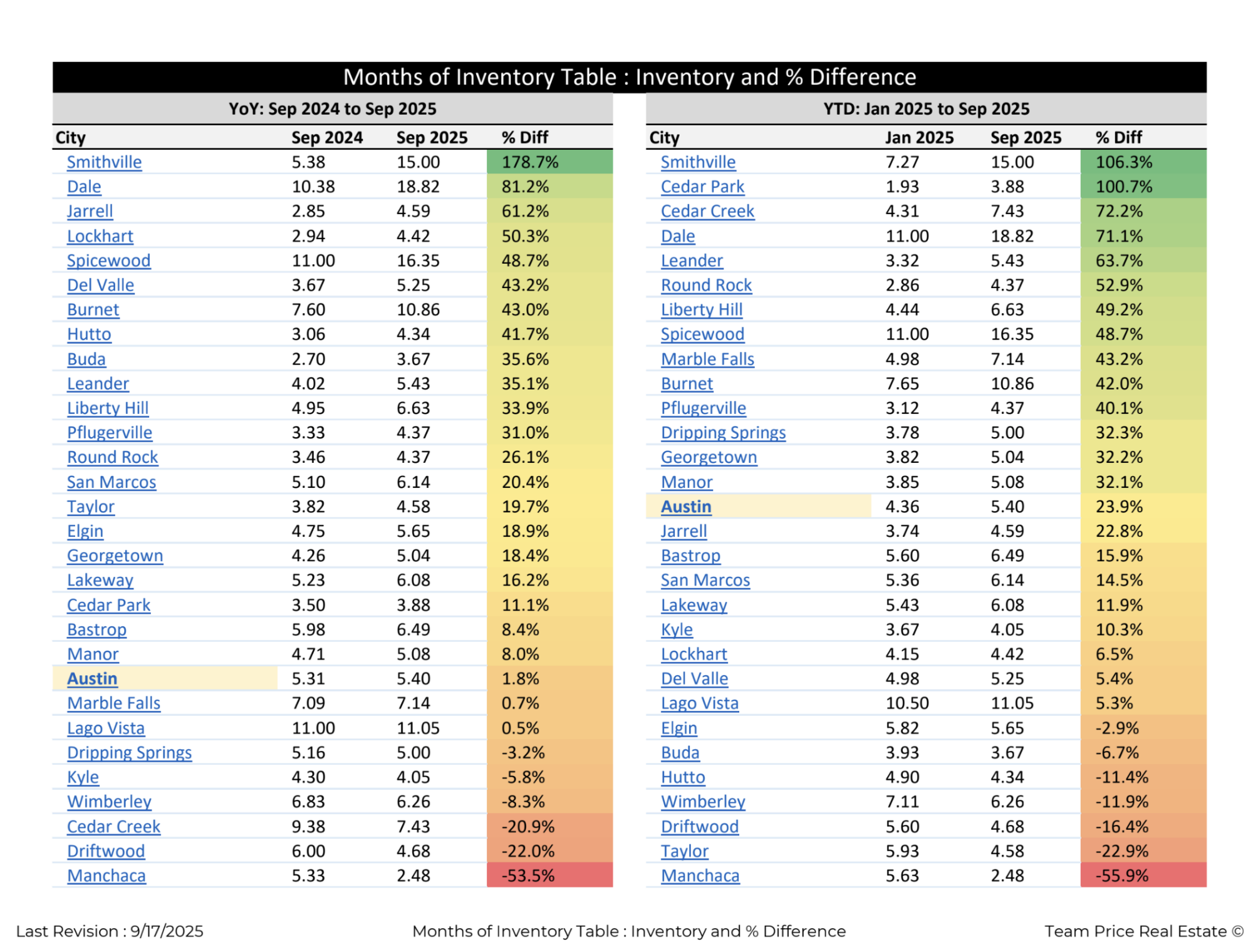 Smithville recorded the most dramatic increase in supply, with inventory climbing from 5.38 months in September 2024 to 15.00 months in September 2025, representing a 178.7 percent surge. Dale followed with an 81.2 percent increase, while Jarrell rose 61.2 percent, and Lockhart grew 50.3 percent. Other notable increases occurred in Spicewood, Del Valle, and Burnet, each posting more than 40 percent growth in inventory.