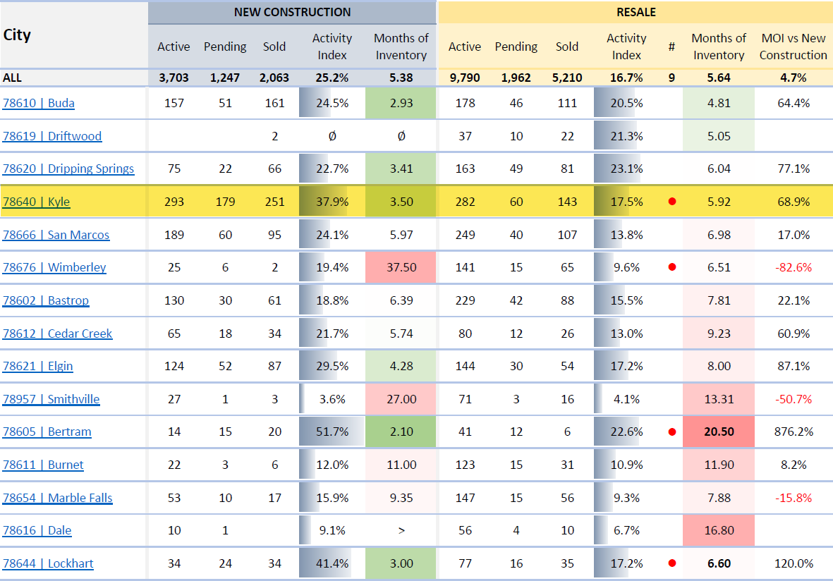 At first glance, Kyle looks strong with a 29.4% Activity Index — a level that suggests a healthy market. But that number hides two very different realities. When you separate new construction from resale, Kyle becomes a clear example of why analyzing combined market data can be misleading.