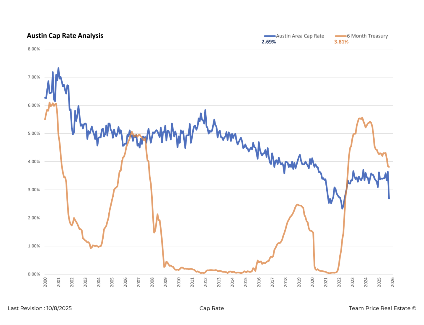 The Austin investment property market continues to face margin pressure as cap rates remain historically low while short-term yields stay elevated. According to the latest analysis, the Austin Area Cap Rate stands at 2.69%, compared with the 6-Month Treasury yield at 3.81%. This marks one of the few periods in the past two decades where Treasury returns exceed average real estate yields in Austin, reshaping investor behavior and risk profiles.